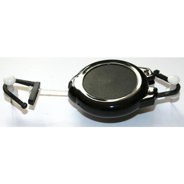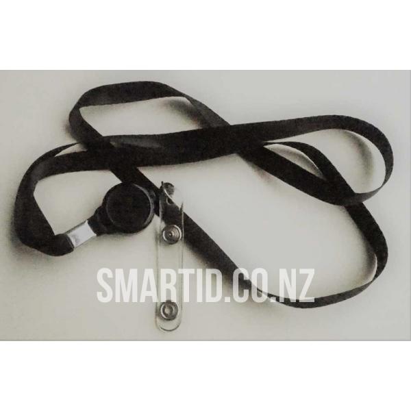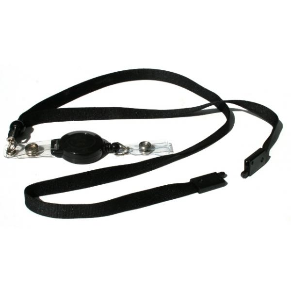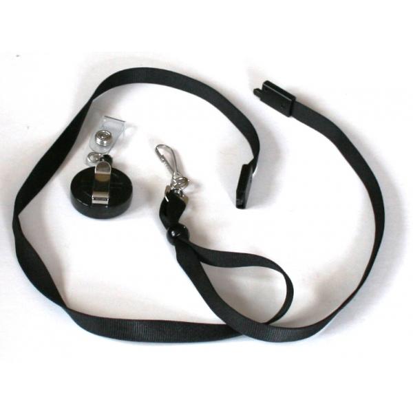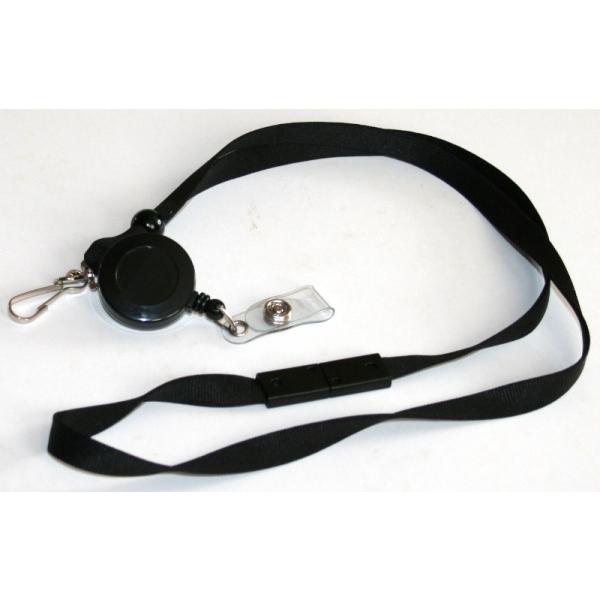 Retractable black Key Pull with Strap Clip, attached to a black lanyard. Comes with handy belt clip on reverse.